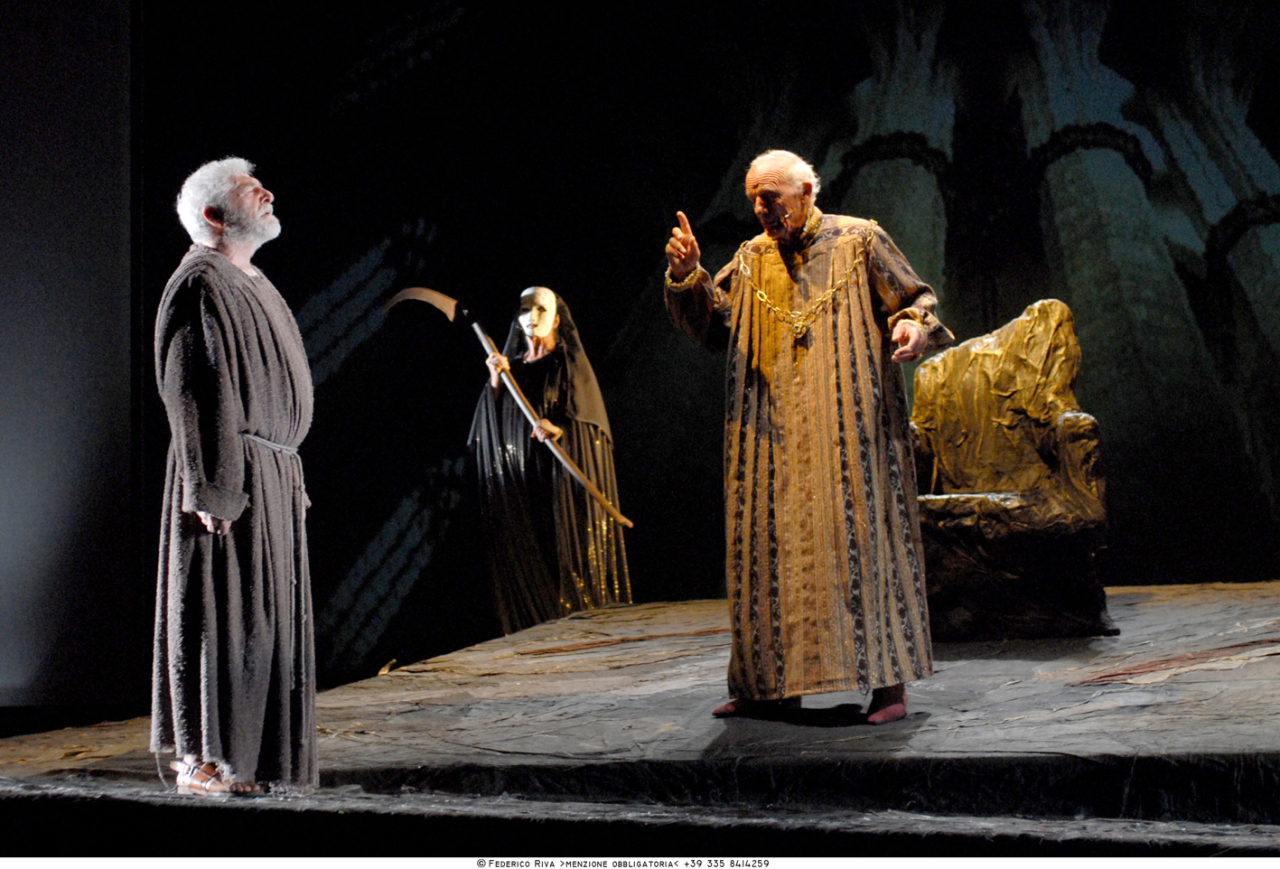 Tours, castello Plessis-du-Parc, albori del Rinascimento. Il re Luigi XI vive imprigionato nella sua dimora spaventato dalla sua malattia, dalla morte, affaticato dall’esercizio del potere. Francesco arriva in Francia e subito ricorda la sua città, Paola, e il suo mare, la vera e unica ricchezza che il povero eremita porta con sé nei suoi viaggi. I due si incontrano davanti al castello e subito, alla vista degli astanti, si presentano come due poli opposti e speculari: il re si inginocchia al cospetto del santo, pregandolo per essere guarito. Il miracolo tuttavia non può avvenire: Luigi non cerca il Dio della misericordia di cui Francesco è portavoce ma il dio che esaudisca il suo personale desiderio di restare attaccato a questa vita.
