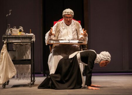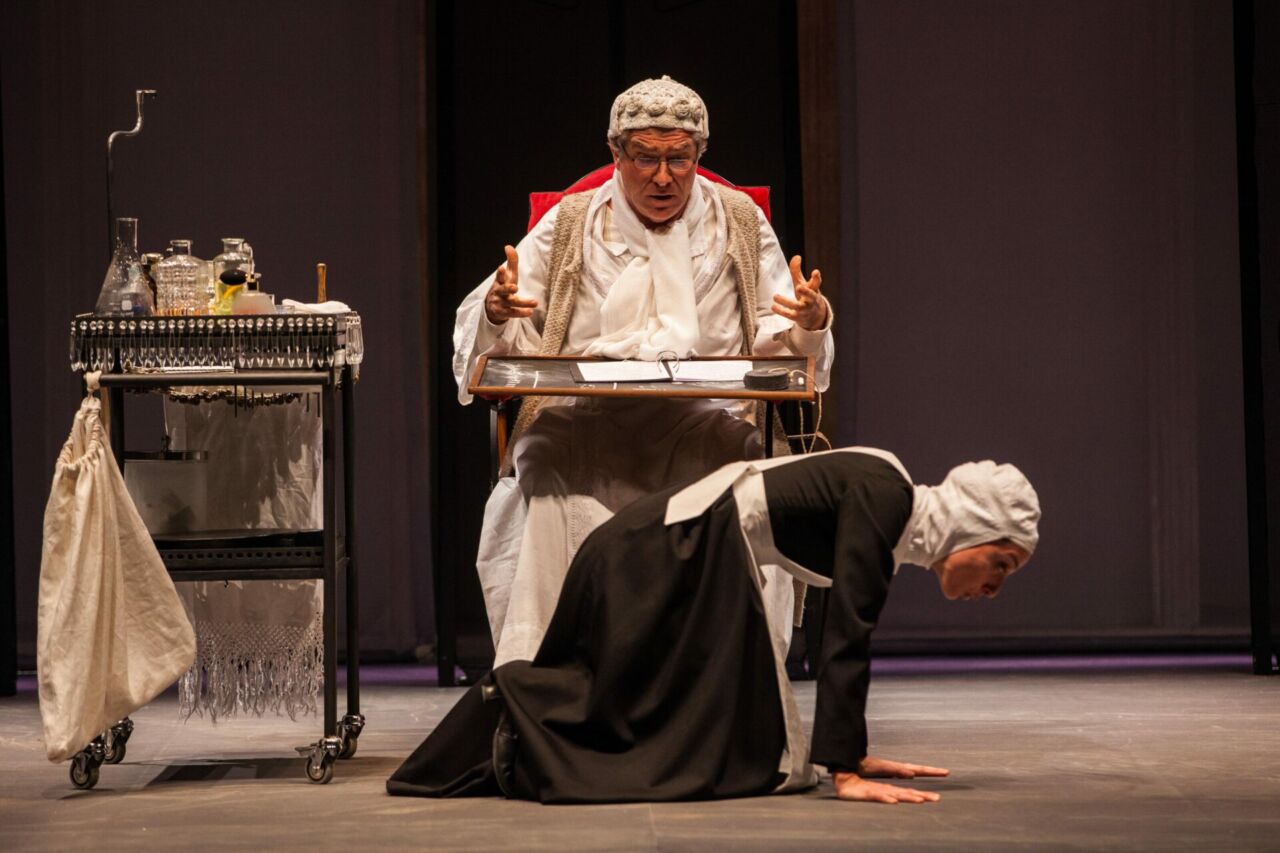Nell’anno del suo Cinquantesimo e a quattrocento anni dalla nascita di Molière, il Parenti apre la stagione 2022/23 con quel “Malato immaginario” che agli inizi degli anni ’80 irruppe nel teatro italiano nel coraggioso allestimento di Andrée Ruth Shammah, con uno straordinario Franco Parenti nel ruolo di Argan. A interpretare il malato con intelligenza e ironia Gioele Dix, già protagonista della pièce nell’allestimento 2015 che registrò un mese di sold out. Sotto la candida cuffia di pizzo, con la vestaglia bianca e le calze molli sui piedi ciabattanti, l’Argan, interpretato da Gioele Dix, testimonia la paura e la solitudine del nostro tempo, l’incapacità genetica di prendere decisioni. Accanto a lui Anna Della Rosa, nel ruolo della domestica intrigante, una perfetta coppia di serva e padrone, a volte bonariamente sboccata, a volte lucidamente beckettiana. La messinscena è imbastita con eleganza e sofisticheria, grazie anche alle scene e ai costumi di Gianmaurizio Fercioni, tra tulle e velluti, preziose mantelle e lampadari luccicanti. Affianca i due bravi protagonisti un ottimo cast ben affiatato, dal perfetto tempismo comico, ma mai gigionesco, nonostante le risate del pubblico e gli applausi a scena aperta.