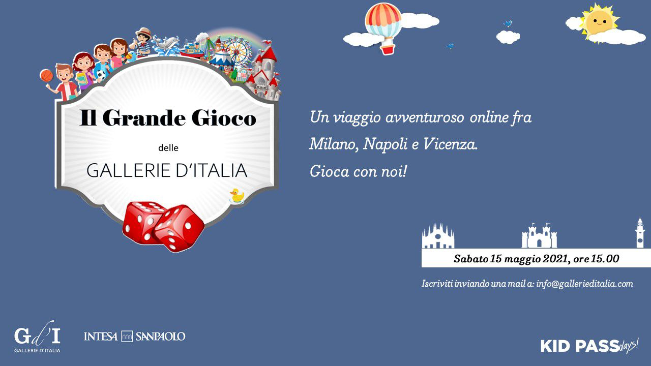 Sabato 15 maggio alle ore 15.00 le Gallerie d’Italia propongono, in particolare ai bambini dai 6 ai 12 anni, il “Grande Gioco delle Gallerie d’Italia”, un appassionante viaggio virtuale che porterà a scoprire paesaggi e personaggi curiosi e affascinanti che hanno percorso secoli e città attraverso tre opere della collezione Intesa Sanpaolo che rappresentano vedute di Milano, Napoli e Vicenza. L’iscrizione si effettua con l’invio di una mail entro venerdì 14 maggio a info@gallerieditalia.com. I partecipanti riceveranno il link all’evento, che si terrà nella piattaforma Webex.