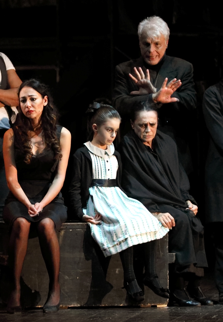 Nei ruoli che designati come “I personaggi della commedia” agiscono dunque Michele Placido (il padre) e Guia Jelo (la madre), affiancati da Dajana Roncione (la figliastra), Luca Iacono (il figlio), Luana Toscano (Madama Pace), e ancora la piccolaClarissa Bauso (la bambina) e Flavio Palmeri (il giovinetto). L’autore li ha abbandonati, negando loro la vita teatrale, esigenza insopprimibile per soddisfare la quale si materializzano in scena e si rivolgono a quelli indicati in copione come “gli attori della Compagnia”, qui affidati all’interpretazione di Silvio Laviano (il regista), Egle Doria (la prima attrice), Luigi Tabita (il primo attore), Ludovica Calabrese (l’attrice giovane), Federico Fiorenza (l’attore giovane), Marina La Placa (la seconda donna), Giorgia Boscarino (l’assistente del regista), Antonio Ferro (il direttore di scena). L’allestimento si avvale delle musiche di Luca D’Alberto e dei costumi di Riccardo Cappello. Gaetano La Mela cura le luci. “Questa – sottolinea Placido – è la mia terza regia teatrale su un testo del Girgentano, dopo Così è se vi pare e i due atti unici La carriola e L’uomo dal fiore in bocca. In passato ho girato un film La scelta, tratto dalla novella e dalla pièce L’innesto, incentrato sulla violenza che una donna subisce. Anche in Sei personaggi è presente una forma di violenza molto ambigua, attuata dal Padre nei confronti dell’umile moglie che pure ha amato e gli ha dato un figlio, ma con la quale ha poco da condividere sul piano intellettuale”.