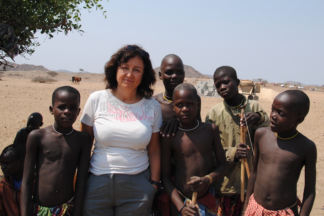 I pastori del parco Iona. È mattina quando ci inoltriamo nel parco Iona, la strada è sterrata, ma in buone condizioni. Il paesaggio si presenta desertico, sassoso con contrafforti di pietra dai colori dorati e dalla forma molto variegata, costituiti da materiale sabbioso, levigato dal tempo e dal vento. La strada corre dritta tra le pietre e le numerose Welwitschia mirabilis, piante millenarie tipiche di questa zona. Gli unici rari incontri, in questo percorso, sono piccoli gruppi di pastori. Incontriamo un primo gruppo per strada: camminano, ai piedi hanno sandali ricavati dai copertoni delle macchine, ci chiedono dell’acqua. Quando li rivediamo al ritorno, dopo diverse ore, li ritroviamo ancora sulla stessa strada, ci chiedono ancora acqua e ci colpisce la voracità con cui la bevono.