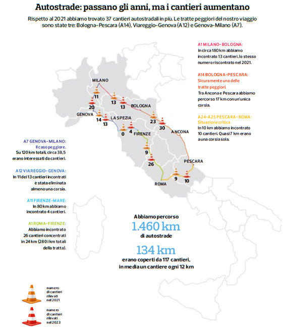 In crescita sia il numero sia la frequenza dei cantieri in autostrada: se nel 2021 in media c’era un cantiere ogni 18 km, nel 2023, si incontra in media un cantiere ogni 12 km. Due anni fa erano stati in tutto 80 i cantieri rilevati in circa 1.500 km percorsi, mentre ad aprile di quest’anno il totale è salito a 117. In alcuni tratti autostradali, inoltre, i cantieri presentano una durata complessiva di più di un anno.