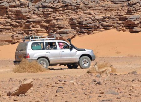 In volo si raggiunge il palmeto della verde oasi di Djanet, una delle poche città stanziali dei tuareg ubicata con le sue case di fango e pietra sotto le pareti precipiti del Tassili, nel passato importante nodo carovaniero e sede di un forte coloniale della Legione Straniera (dove merita una visita il folcloristico souk e il museo ricco di reperti preistorici e strumenti tuareg), per attraversare una zona di isolati pinnacoli di roccia, uno dei quali presenta una delle più espressive incisioni rupestri del neolitico sahariano: la cosiddetta “vacca che piange” di Terarat, un bassorilievo finemente inciso di bovini che vorrebbero abbeverarsi ad una pozza ormai secca, eloquente testimonianza della tragedia climatica che 5.000 anni fa ha investito il Sahara, trasformandolo da una rigogliosa oasi di vita ad un deserto arido ed infuocato.