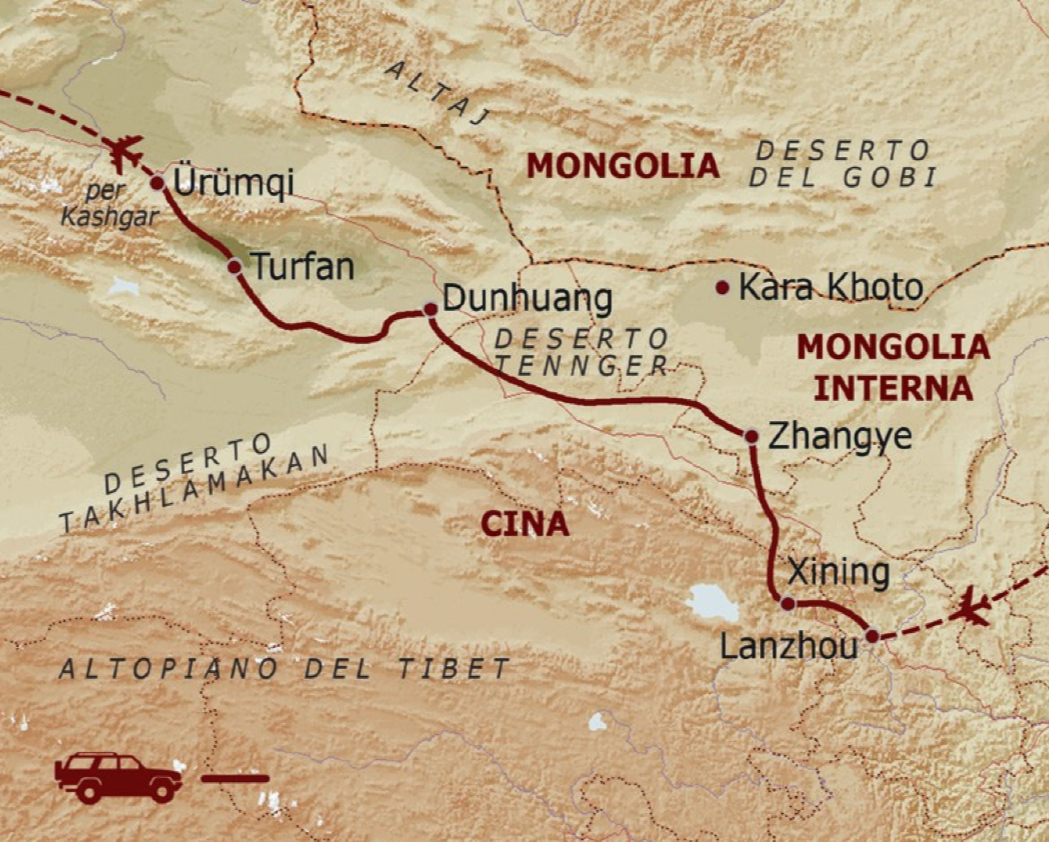Un viaggio lungo l’antica Via della Seta è un viaggio tra storia e leggenda. Dalla capitale dell’Impero Celeste, alle province del Gansu e del Qinghai con gli antichi monasteri tibetani ricchi di tradizioni e religiosità: le grotte di Binglingsi sul fiume Giallo, raggiungibili solo via fiume; i monasteri di Labrang e Ta’er; il “Buddha dormiente” di Zhangye; le “Montagne Arcobaleno”, una vasta area caratterizzata da particolari stratificazioni di rocce colorate; Jayuguan, l’ultimo baluardo della Grande Muraglia; le incredibili grotte di Mogao a Dunghuang (UNESCO). Si prosegue per le suggestive rovine delle città morte nei pressi dell’oasi di Turpan nello Xinjiang. Quindi Kashgar, per assistere al mercato domenicale che richiama tutte le etnie della regione: Uiguri, Tajiki, Kyrghizi. Poi l’altopiano del Pamir, con una sosta . Attraversato il Torugart Pass (circa 4000 m) ci si addentra tra le montagne del Kyrghizstan, nel cuore dell’Asia Centrale, un mondo totalmente diverso. Si trascorre una notte in yurta, sulle rive del lago Song-kul, nel vero spirito nomade, ospiti di una famiglia di pastori kyrghizi. Poi il grande lago Issyk-kul e la moderna capitale Bishkek. Viaggio condotto da un accompagnatore italiano esperto.