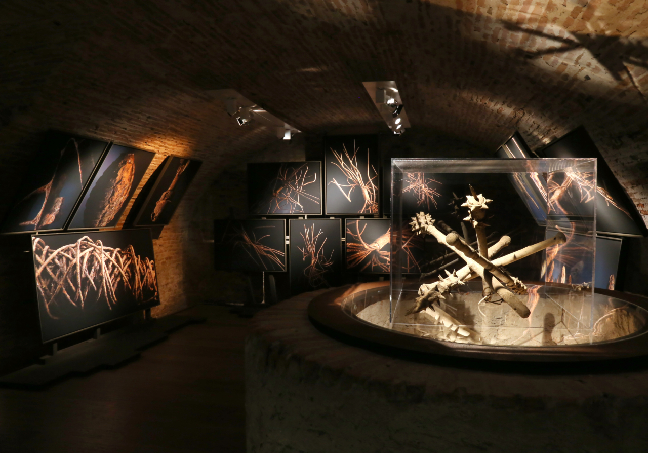 Nessun intento “celebrativo”, nessuna carrellata di “memorabilia” in questa rassegna emozionale curata da Mauro Passarin. Ma “solo” potentissime, stranianti immagini di oggi. Realizzate da Giuliano Francesconi secondo i più sofisticati canoni dello still life, esplose a grandissime dimensioni. Immagini scabre, rugginose, vere. Avvolgono e sovrastano il visitatore, sapientemente inserite da Mauro Zocchetta in uno spazio sotterraneo. E’ uno spazio di Palladio e quindi bellissimo. Come erano bellissime certe giornate in alta quota sulle montagne del vicentino. Uno spazio protettivo ma aperto, esattamente come lo erano i dedali di trincee che solcavano le balze dei monti dai nomi tragicamente celebri: Ortigara, Pasubio, Cimone, Cengio, Grappa…