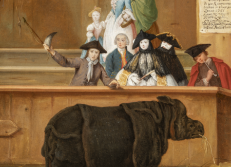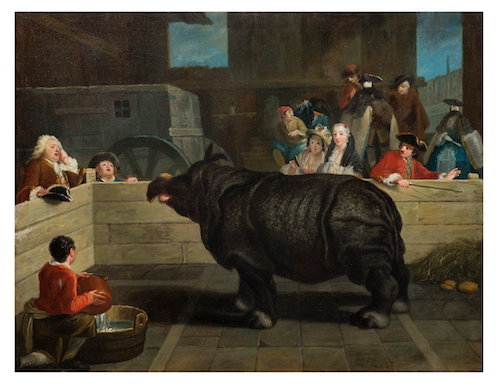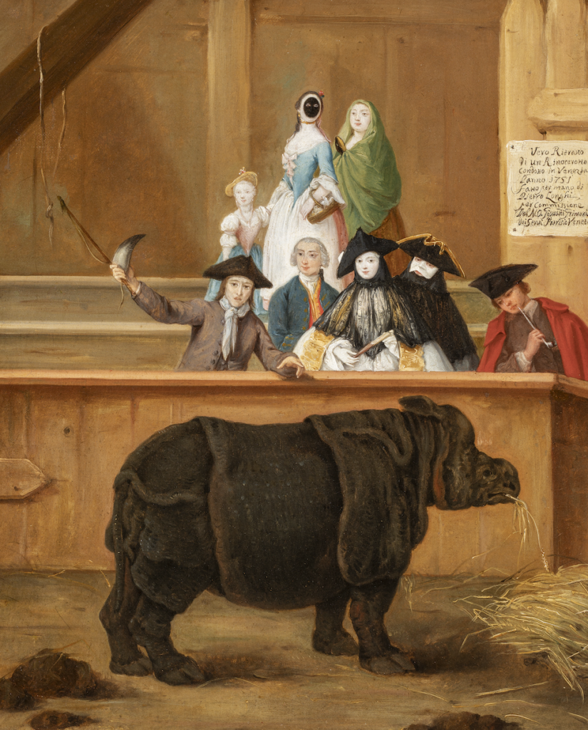 Clara non è il primo rinoceronte apparso in Europa, ma è sicuramente quello che divenne più famoso. Nel 1741 sbarca a Nieuwendam nei pressi di Amsterdam dopo un lungo viaggio dall’India. Il suo proprietario, Douwe Mout van der Meer, la mostra a chiunque sia disposto a pagare per ammirarla: dalle corti reali alle fiere e ai mercati, perfino come speciale attrazione durante il carnevale. Con il suo seguito, per circa diciassette anni Clara viaggia attraverso l’Europa su un carro costruito appositamente per lei. Tocca quasi tutte le grandi città dell’epoca: da Vienna a Parigi, da Napoli, Roma, Venezia, a Copenaghen. Nelle pause di viaggio in territorio olandese viene sistemata nel terreno denominato ‘t Meertje al nord di Amsterdam. Morirà poi a Londra nel 1758. Clara è stata toccata, derisa, ammirata e studiata. Soprattutto considerata un fenomeno da non perdere. Lo stupore e l’interesse suscitati da Clara derivavano dal fatto che nessuno aveva mai visto un rinoceronte dal vivo. Naturalmente tale interesse era fortemente alimentato da Mout con stampe pubblicitarie e medaglie. Fino all’arrivo di Clara in Europa, l’unica immagine nota di un rinoceronte era una stampa realizzata nel 1515 dal famoso artista Albrecht Dürer. L’opera si basava sullo schizzo di un rinoceronte che aveva soggiornato a Lisbona per un breve periodo; ma si trattava di uno schizzo non molto accurato al punto che nella stampa viene aggiunto un corno sulla schiena dell’animale che presenta una pelle più simile ad una corazza. La situazione cambia con l’arrivo di Clara, che permette di approfondire la conoscenza del rinoceronte e di tracciarne un’immagine più realistica. Gli studiosi la esaminano da vicino dalla testa alla coda e gli artisti rimangono affascinati da ogni dettaglio. Vengono realizzate numerose immagini di Clara, in ogni forma e materiale. Nella mostra sono esposte alcune tra le opere più significative, quali l’impressionante ritratto a grandezza naturale dipinto da Jean-Baptiste Oudry a Parigi nel 1749 (Staatliches Museum Schwerin), una tela di Pietro Longhi (Ca’ Rezzonico Venezia), dove Clara viene mostrata al pubblico mascherato durante il Carnevale veneziano del 1751, una grande scultura in marmo dell’artista di Gand Pieter Anton Verschaffelt proveniente dalla Collezione Rothschild di Waddesdon Manor e un rarissimo orologio proveniente da una collezione privata olandese, del bronzista e orologiaio parigino Jean-Joseph de Saint-Germain, dove Clara rappresenta l’elemento portante.