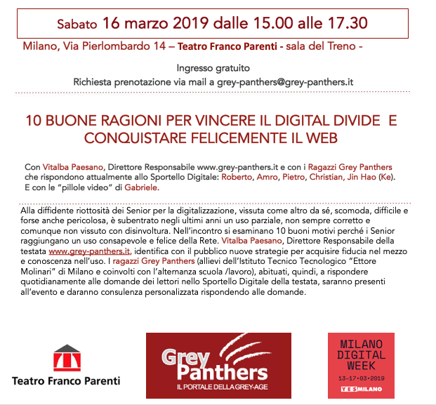 2 thoughts on “16 marzo 2019- Teatro Franco Parenti: “10 buone ragioni per vincere il Digital Divide e conquistare felicemente il web””