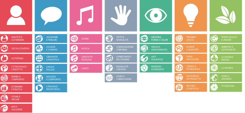 “Howard Gardner insegna Scienze cognitive e Psicologia dell’Educazione alla Harvard University. Specializzato in scienza dell’apprendimento e in neuropsicologia, è direttore del Progetto Zero, un programma sperimentale sui meccanismi dell’apprendimento. Noto in tutto il mondo per i suoi studi sull’intelligenza e per la Teoria delle Intelligenze Multiple ha affermato: “Non nasciamo con una, ma con più intelligenze, più modi di pensare”. L’idea alla base dei nostri giochi è quindi un Menu di Competenze (vedi immagine) atto a sviluppare le intelligenze del bambino attraverso l’acquisizione di una gamma di capacità ricca, ma al tempo stesso essenziale sia in senso orizzontale, comprendendo i sistemi di base e le discipline più utili ed emergenti, sia in senso verticale, concentrando l’approccio sui nuclei fondanti di ciascun sapere. Su ogni nostro prodotto è presente, quindi, una piccola didascalia che esprime, in percentuale, quali di queste competenze il gioco stimola e aiuta a sviluppare”.