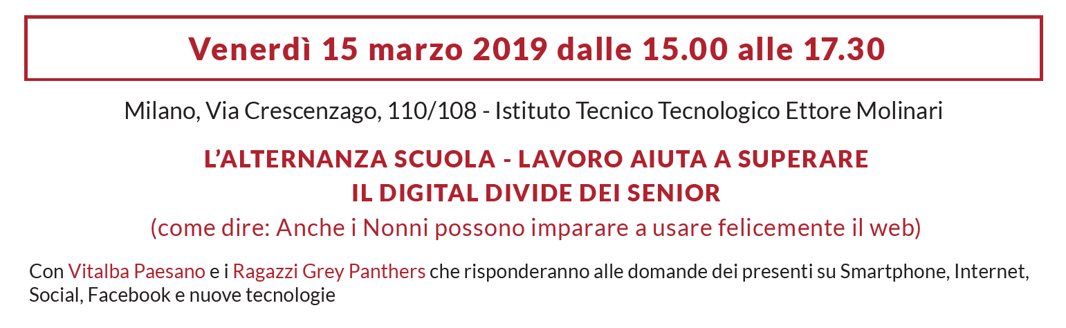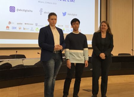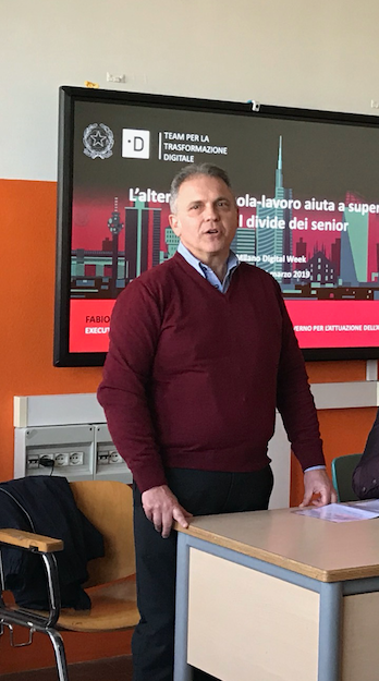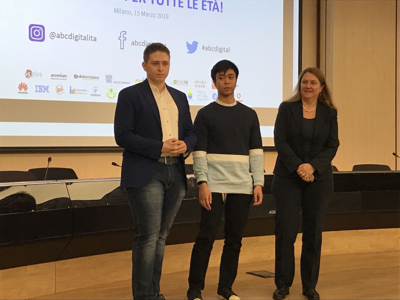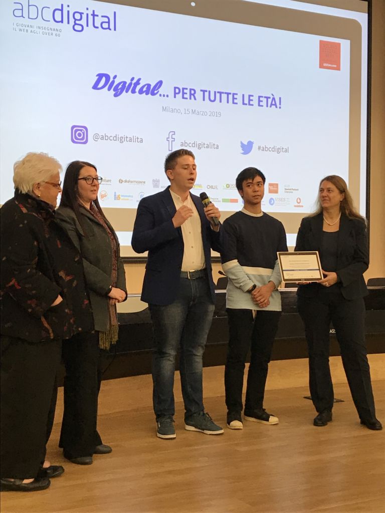 Gabriele Resigotti, tra gli allievi premiati, racconta l’esperienza di alternanza allo Sportello Digitale di grey-panthers.it. Da destra: la professoressa Manuela Fiore, due allievi premiati, Paola Rossetti, Responsabile del Progetto Abcdigital in Assolombarda, e Vitalba Paesano, Direttore di grey-panthers.it, che ha premiato l’Istituto Molinari