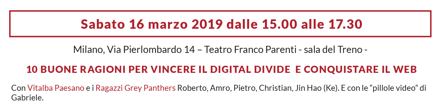 16 marzo: al teatro Franco Parenti, 10 buoni motivi per convincere tutti a diventare veri cittadini digitali Pubblicato il 17 Marzo 2019 in Technology Come diventare cittadino digitale a Milano Condividi Fai clic per condividere su Facebook (Si apre in una nuova finestra) Facebook Fai clic per condividere su X (Si apre in una nuova finestra) X Fai clic qui per condividere su Pocket (Si apre in una nuova finestra) Pocket Fai clic qui per condividere su LinkedIn (Si apre in una nuova finestra) LinkedIn Fai clic per condividere su WhatsApp (Si apre in una nuova finestra) WhatsApp Fai clic qui per stampare (Si apre in una nuova finestra) Stampa Correlati