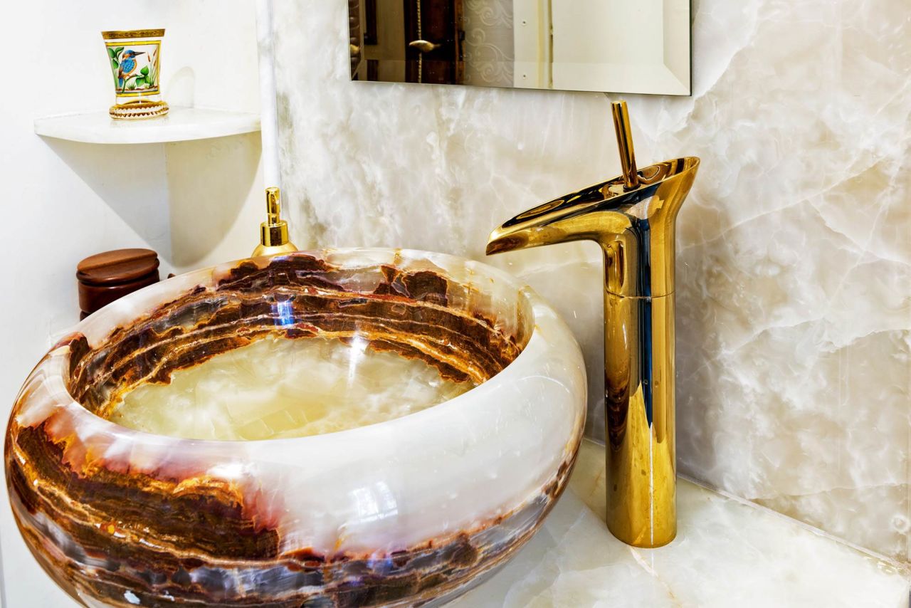 Scelta rigorosa di materiali pregiati: parquet in legno intarsiato e marmi rari come il preziosissimo Azul, per i pavimenti e i rivestimenti. Pietre dure e preziose, tra cui onice verde, lapislazzuli e rubino, le stesse utilizzate per la creazione dei gioielli, per la decorazione degli interni. Finiture in oro 18 carati per le rubinetterie dei bagni. Tendaggi di design e tessuti damascati per le pareti
