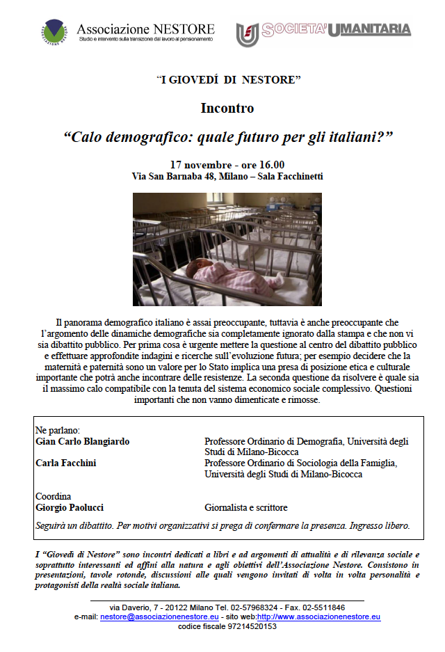 Comunichiamo che sul quotidiano “Corriere della Sera” di ieri, 16 novembre, a pagina 20, è stata pubblicata un’intervista al demografo, Prof. Gian Carlo Blangiardo, che sarà uno dei relatori dell’incontro di domani per “I Giovedì di Nestore” dal titolo “Calo demografico: quale futuro?”. Appuntamento dunque domani 17 novembre alle ore 16.00, via San Barnaba 48- Milano Sala Facchinetti