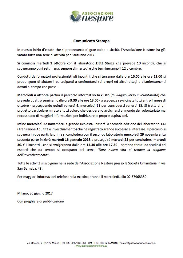 Gli appuntamenti d’autunno dell’Associazione Nestore Pubblicato il 19 Luglio 2017 in L’Associazione Nestore ha varato una serie di attività per l’autunno 2017: laboratori, incontri, corsi che accompagneranno gli iscritti nell’ultima parte dell’anno. Ecco i primi appuntamenti in calendario: Condividi Fai clic per condividere su Facebook (Si apre in una nuova finestra) Facebook Fai clic per condividere su X (Si apre in una nuova finestra) X Fai clic qui per condividere su Pocket (Si apre in una nuova finestra) Pocket Fai clic qui per condividere su LinkedIn (Si apre in una nuova finestra) LinkedIn Fai clic per condividere su WhatsApp (Si apre in una nuova finestra) WhatsApp Fai clic qui per stampare (Si apre in una nuova finestra) Stampa Correlati