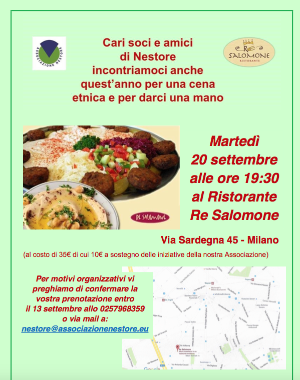 Vi invitiamo alla cena che si terrà martedì 20 settembre alle ore 19.30 presso il ristorante “RE SALOMONE” – Via Sardegna 45 – Milano.