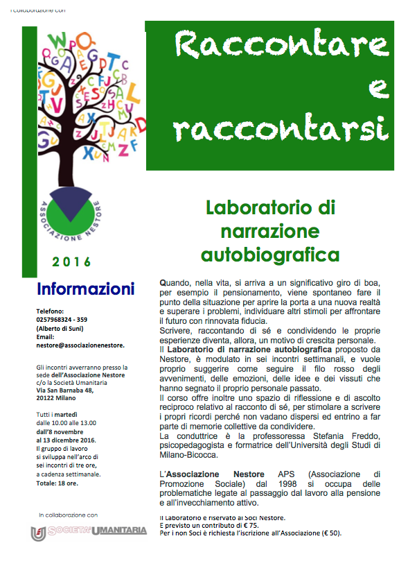Il Laboratorio di narrazione autobiografica proposto da Nestore, è modulato in sei incontri settimanali, e vuole proprio suggerire come seguire il filo rosso degli avvenimenti, delle emozioni, delle idee e dei vissuti che hanno segnato il proprio personale passato. Il corso offre inoltre uno spazio di riflessione e di ascolto reciproco relativo al racconto di sé, per stimolare a scrivere i propri ricordi perché non vadano dispersi ed entrino a far parte di memorie collettive da condividere.
