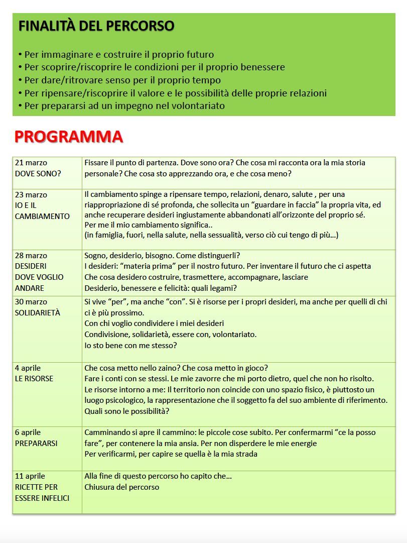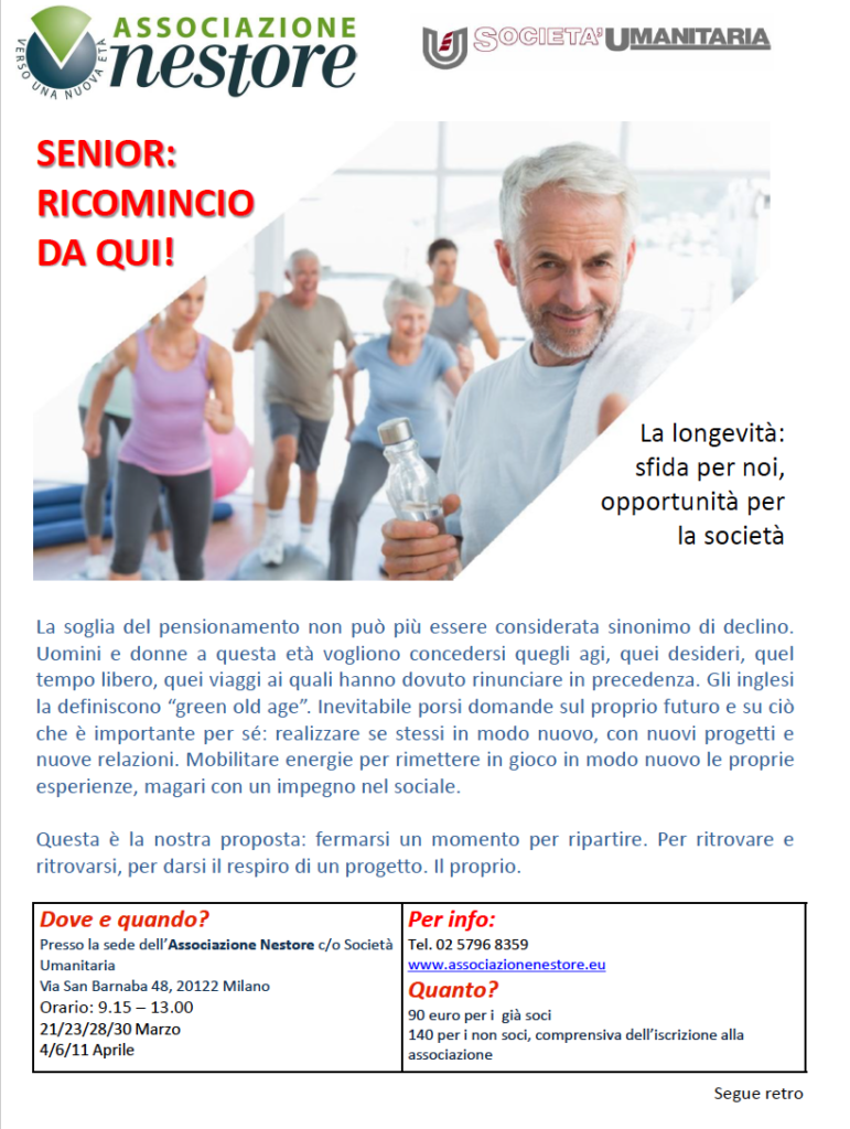 Spazio ai desideri, al mio benessere, a nuovi incontri, a nuovi interessi. A una nuova vita insomma. La chiamano nuova longevità: ed è così. Mi sento di poter ancora dare, di poter fare. E voglio farlo. Ma devo pensarci un attimo. Tutto questo tempo che (ora che non lavoro più) ho a disposizione, lo voglio spendere bene, anzi benissimo. Voglio progettarlo per bene: un po’ per me, un po’ per gli altri, magari in un impegno nel volontariato. E l’Associazione Nestore può aiutarmi: 7 incontri, un percorso tutto per me, dove condividere con altri sogni e progetti. Il titolo? “Senior: ricomincio da qui”. Io ci vado. E tu?