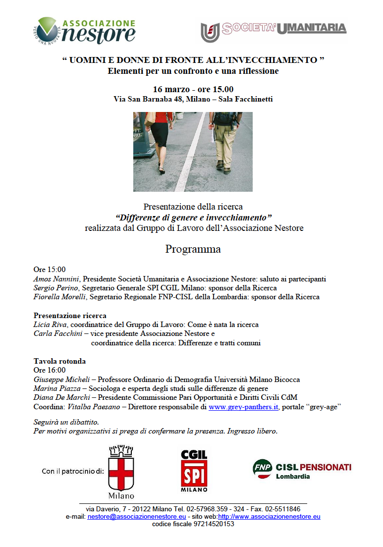 Associazione Nestore – Archivio 2016 – 2017 Qui Nestore- Bollettino di settembre 2016 Active ageing, una conquista possibile, di Licia Riva e Gualtiero Castelli Ottobre 2016: ecco “Nestore Informa”, il semestrale culturale dell’Associazione Raccontare e raccontarsi: una nuova iniziativa Nestore longevità dentale La fragilità delle donne? Cresce in terza età Qui Nestore, Bollettino di dicembre 19 gennaio, nuova edizione del Laboratorio di Narrazione Autobiografica nestore Gli appuntamenti d’autunno dell’Associazione Nestore I giovedì di Nestore: 21 settembre presentazione del libro di Fulvio Scaparro “L’antispocchia” Grey-panthers e Nestore: un cammino cominciato tempo fa 4 ottobre: Volontariato? Io ci sto! Profit e non profit: un incontro possibile? L’ETA’ S…TERZA, dieci incontri per capire come sterzare senza sbandare Qui Nestore: Bollettino di Novembre “Come essere in forma e vivere felici”, per i giovedì di Nestore Ai giovedì di Nestore, domani 16-11, attento zoom sul calo demografico Gli appuntamenti di gennaio- le anticipazioni di febbraio I giovedì di Nestore: “Non ho l’età”, giovedì16 febbraio ore 16 Qui Nestore: il Bollettino e gli incontri di febbraio Riprogettarsi: questo il prossimo progetto Nestore Il bollettino e le iniziative di marzo Nestore café e la memoria resta amica “Luci a Milano”: un concorso fotografico a premi 16 marzo: un appuntamento e una riflessione Teatro Fontana “Io e gli altri”, un rapporto migliorabile a ogni età nestore Qui Nestore: il bollettino e le iniziative di maggio 2017 bonus casa “La casa bene sociale e la qualità della vita”: un nuovo incontro dell’Associazione Nestore nestore Qui Nestore: il bollettino e le iniziative di giugno 2017 Prossimo appuntamento: 20 settembre, a cena