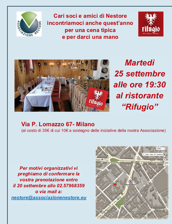Per motivi organizzativi vi preghiamo di confermare la vostra prenotazione entro il 20 settembre allo 02.57968359 o via mail: nestore@associazionenestore.eu. Vi chiediamo inoltre, se possibile, di passare in Associazione al mattino per effettuare anticipatamente il pagamento oppure di farlo tramite bonifico (IBAN IT 39 M 05584 01621 000000042676), al fine di semplificare le operazioni di pagamento la sera della cena.