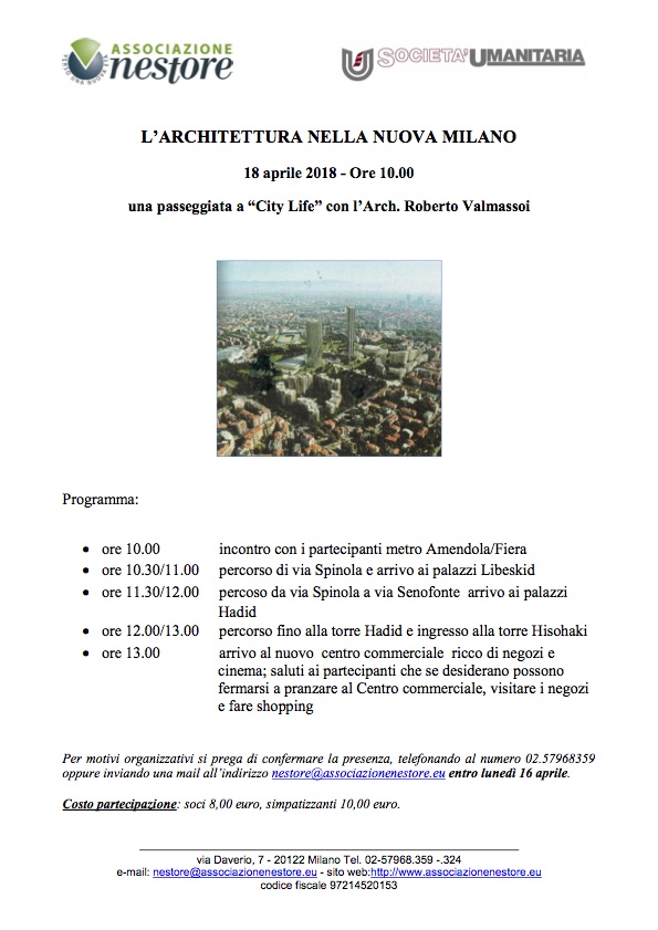Associazione Nestore organizza una serie di incontri nei luoghi che in questi anni hanno cambiato il volto della nostra città. Abbiamo chiamato questi incontri “Architettura della nuova Milano”; durante i quali visiteremo: City Life, Portello, Bicocca e Porta Nuova. Quattro grossi interventi che hanno trasformato urbanisticamente queste zone. Durante queste passeggiate esplorative saremo accompagnati dall’Architetto Roberto Valmassoi, socio di Nestore.