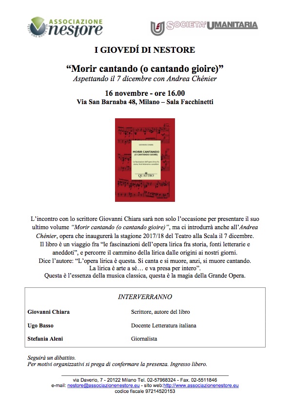 Il 16 novembre alle ore 16 in Sala Facchinetti (Società Umanitaria), Associazione Nestore presenta il libro “Morir Cantando (o cantando gioire)” dello scrittore Giovanni Chiara. Il libro è un viaggio fra “le fascinazioni dell’opera lirica fra storia, fonti letterarie e aneddoti” e percorre il cammino della lirica dalle origini ai nostri giorni contribuendo a spiegare come quattro secoli di opera lirica debbano ritenersi rappresentativi di una delle più alte espressioni della cultura occidentale. Inoltre è un’occasione per l’autore di parlare dell’opera “Andrea Chénier” di Umberto Giordano, opera che inaugurerà la stagione 2017/18 del Teatro alla Scala il 7 dicembre.