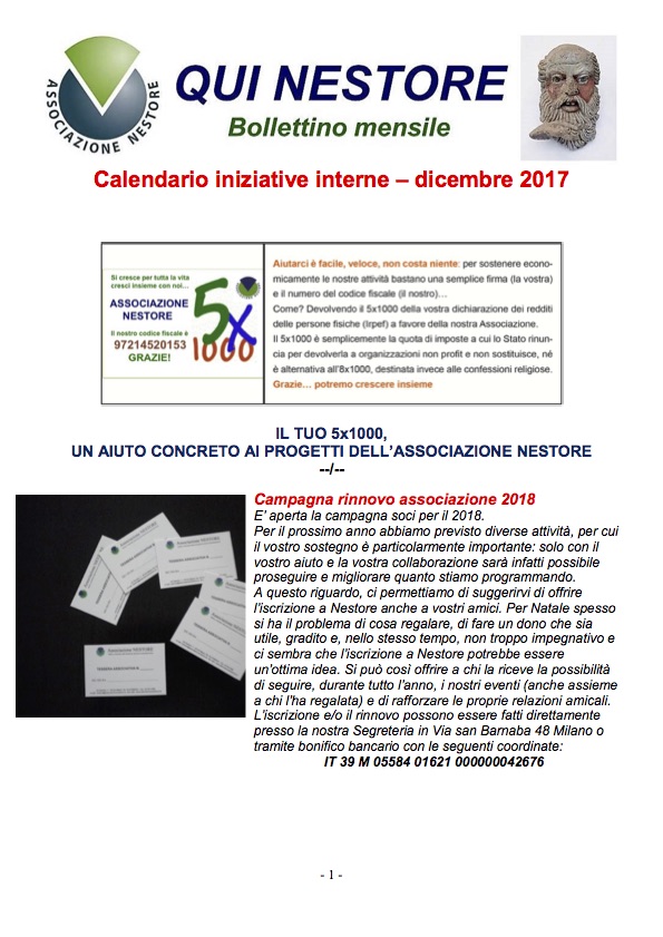 Il bollettino del mese di dicembre. Una panoramica sulle attività, i corsi e le iniziative associative che animeranno questo fine 2017 e l’inizio del 2018 per l’Associazione Nestore. Con un invito speciale al brindisi natalizio, il 14 dicembre.