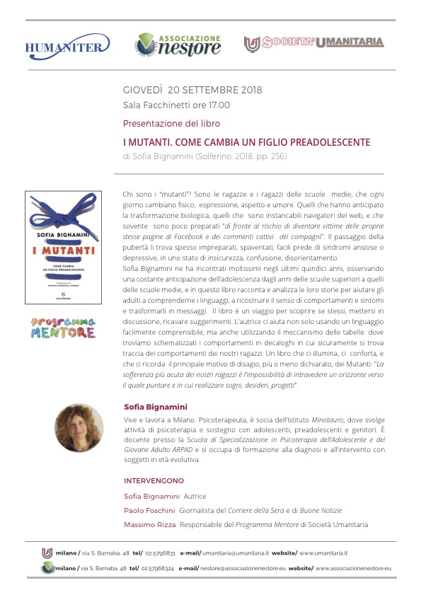 L’Associazione Nestore in collaborazione con la Società Umanitaria e Fondazione Humaniter, dedicato un evento speciale alla presentazione di un libro molto particolare che è stato pubblicato recentemente: “I Mutanti” di Sofia Bignamini, psicoterapeuta e socia dell’Istituto Minotauro, dove svolge la propria attività in aiuto agli adolescenti ed ai loro genitori. La presentazione si terrà giovedì 20 settembre ore 17.00 – Sala Facchinetti – Via San Barnaba 48 – Milano.