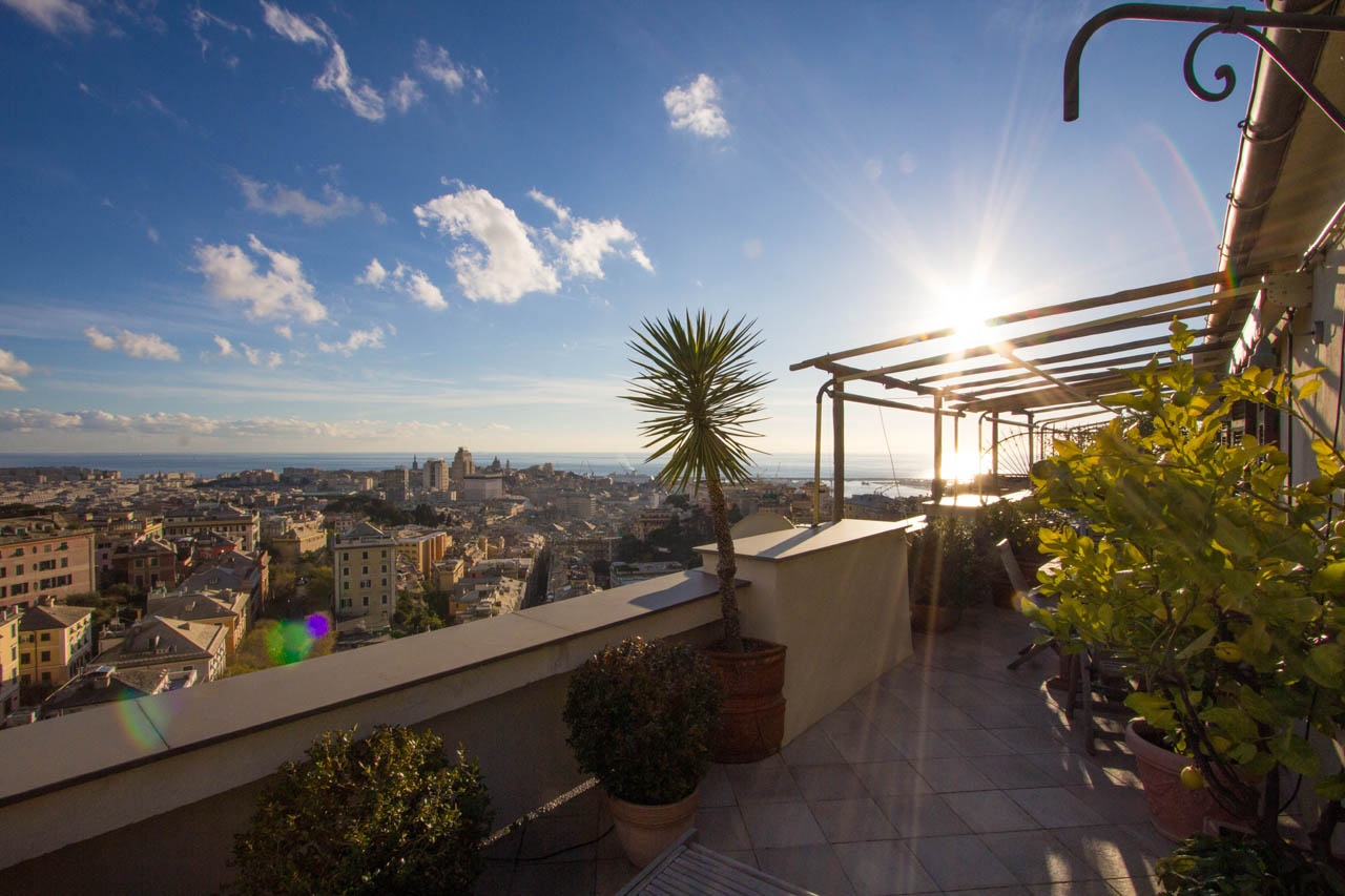 Una struttura completamente rinnovata negli interni, nel quartiere di Castelletto, a Genova, con una meravigliosa vista sul mare oltre i tetti del centro storico.