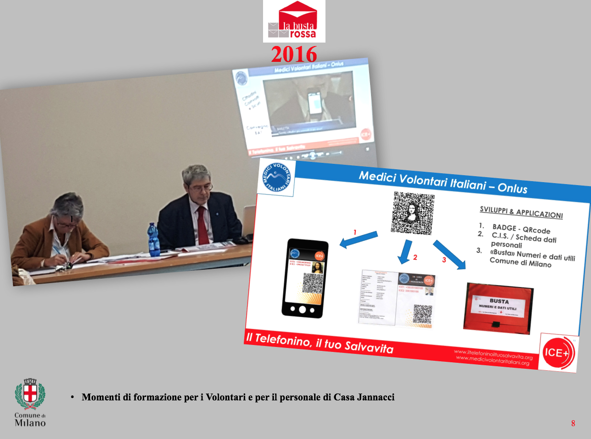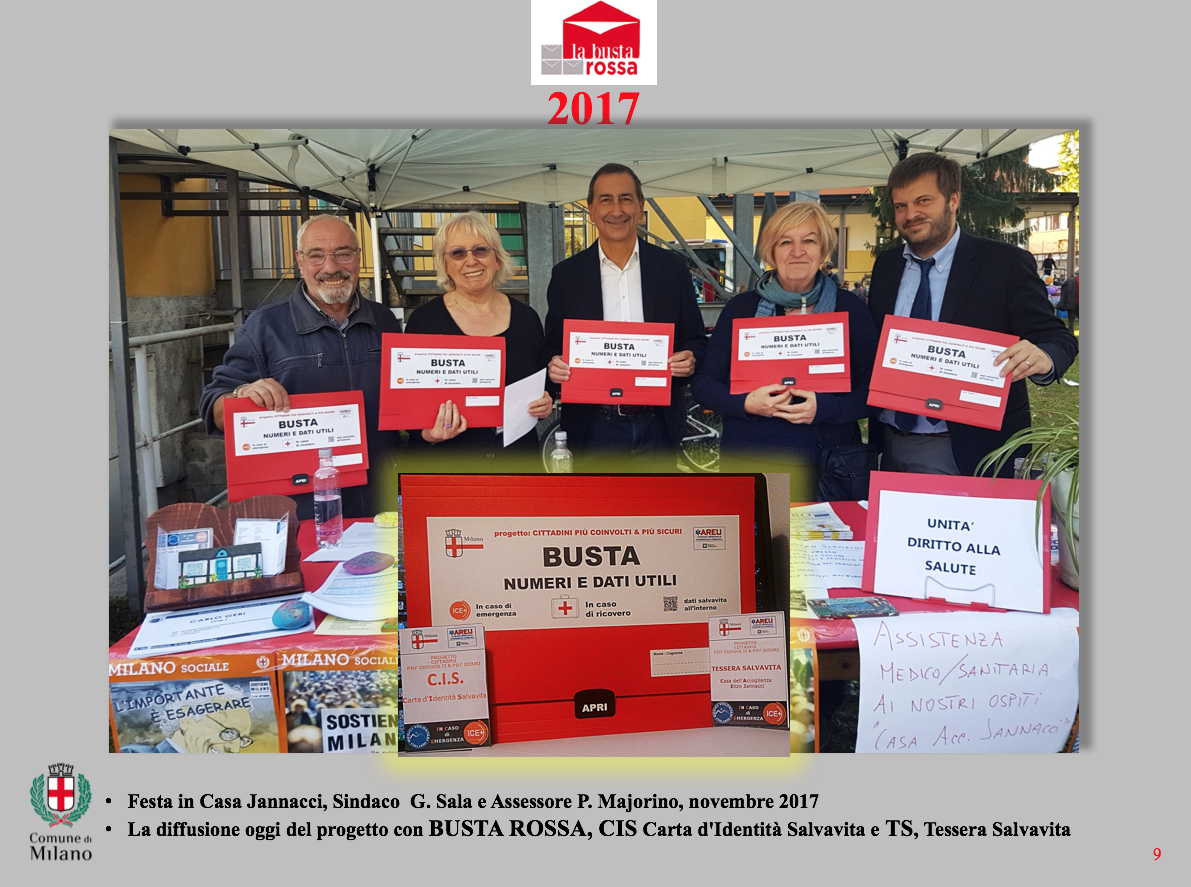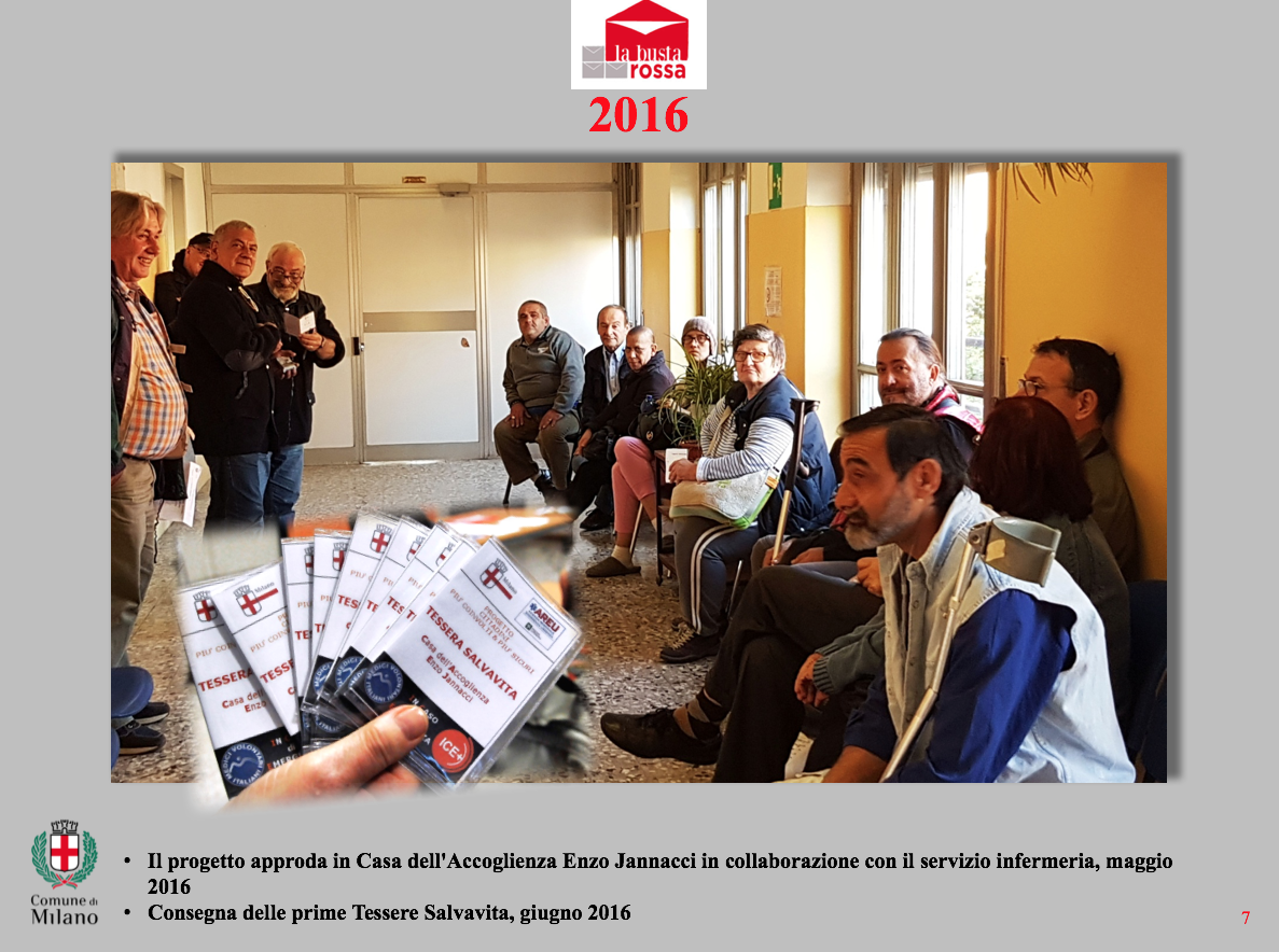 arrivati. Sono i Volontari iscritti all’Albo del Comune di Milano, che attesta e certifica un impegno personale e generoso, dalle caratteristiche di eccellenza. Ogni anno a dicembre partecipano alla premiazione dei Volontari promossa dall’Assessore Politiche Sociali e per l’occasione si presentano come Gruppo Volontari BUSTA ROSSA per festeggiare gli ormai 7 anni di attività del Progetto, dal 2013 al 2019, e hanno riunito immagini e ricordi a testimoniare un impegno davvero DOC. Il Gruppo Volontari Busta Rossa è fondato su due principi: