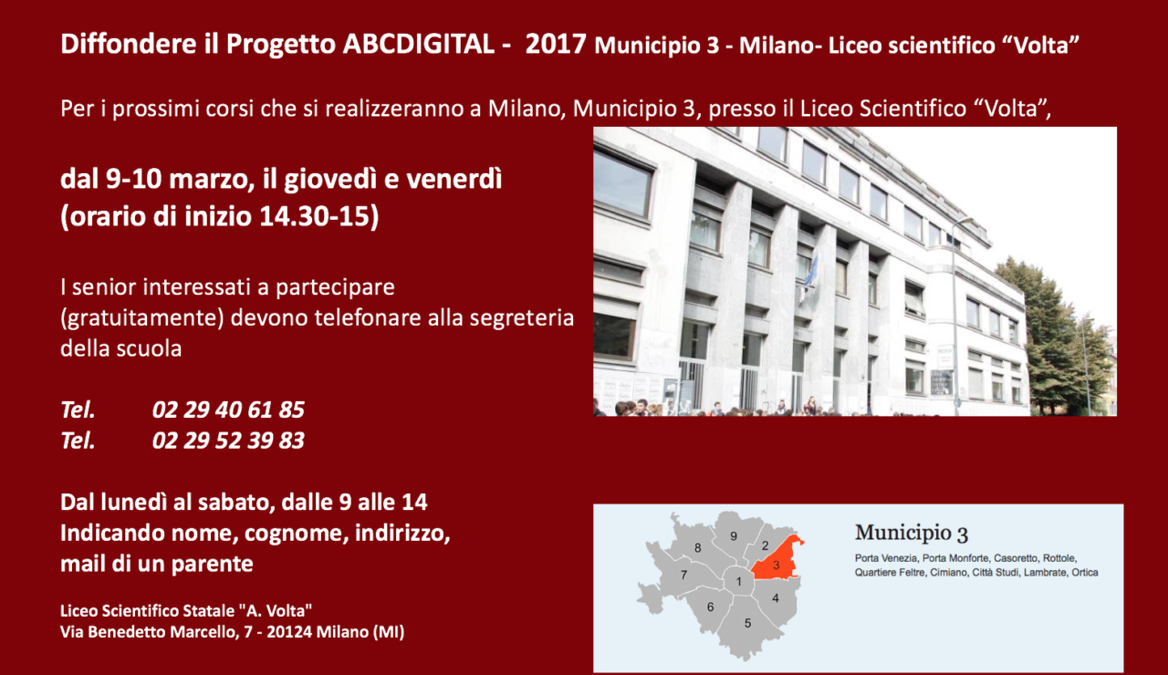 Frequentare un corso Abcdigital e conseguire l’attestato di partecipazione è molto semplice: basta iscriversi ai corsi e seguire il calendario delle lezioni, comodo (i corsi sono attivabili in qualsiasi momento e in ogni città, in questo caso parliamo di Milano e Municipio 3, nelle aule del Liceo Volta, in piazza Benedetto Marcello) e gratuito (non sono previsti costi di iscrizione e/o organizzazione), e permette di conoscere tutti quegli aspetti utili, ma anche divertenti, che il web propone.