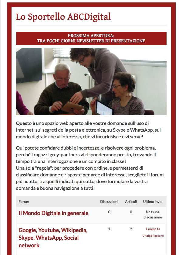 Ma il successo di AbcDigital, della vostra attività di alternanza scuola-lavoro, della nostra azione di comunicazione, si misurerà nello sportello digitale, che deve diventare strumento in mano ai senior per togliere ogni dubbio o curiosità. Dedicate allo sportello tempo e attenzione. A rispondere, oltre a noi della Redazione, ci sono altri vostri colleghi, impegnati a vivere con noi la loro esperienza di scuola-lavoro.
