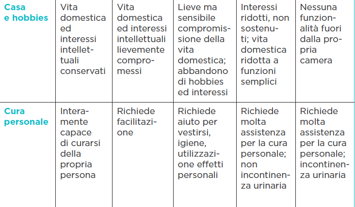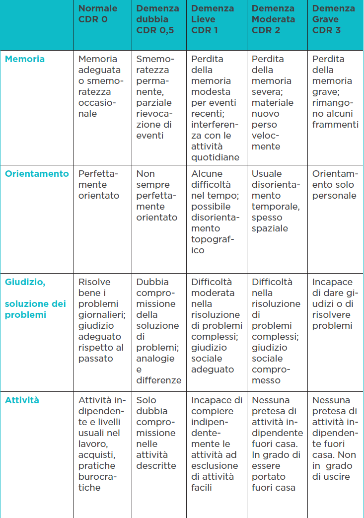 Il decorso delle demenze è complesso, non prevedibile sia dal punto di vista della rapidità dell’evoluzione sia per quanto riguarda la frequenza e la sequenza dei disturbi cognitivi e del comportamento, che nelle diverse fasi di malattia possono susseguirsi. A grandi linee la gravità della malattia è ben rappresentata dalla “Clinical Dementia Rating scale” (CDR) (schema qui sotto) che delinea quali siano le modificazioni delle principali aree cognitive, funzionali e sociali mano a mano che la malattia evolve in senso peggiorativo.