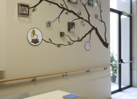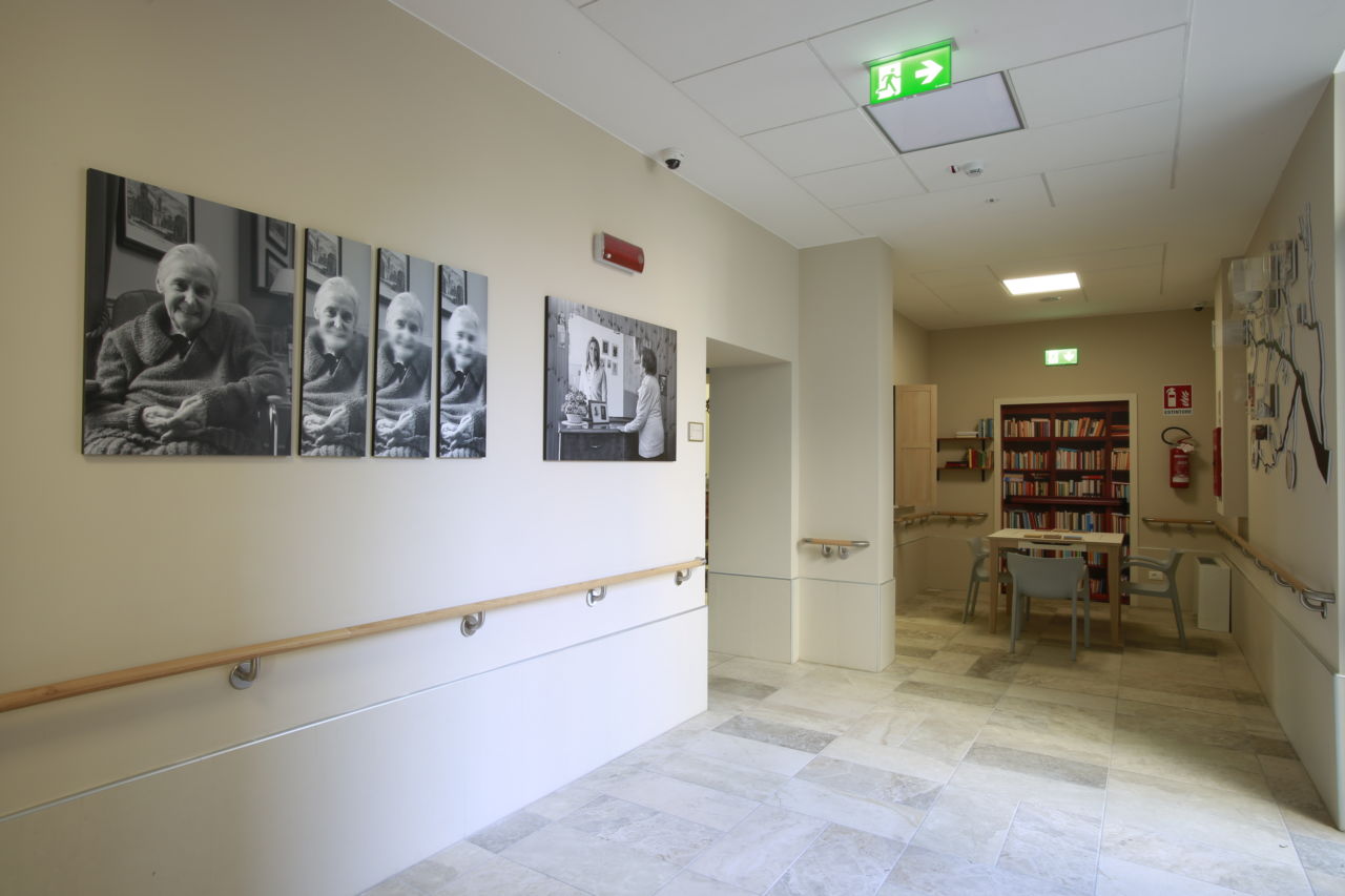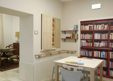 8. Spazio riabilitativo: per attivare la memoria, l’orientamento e le capacità cognitive del malato di Alzheimer si può fare ricorso a piccoli oggetti del quotidiano e fotografie (‘Albero della vita’), a stimolazioni cromatiche e tattili (Tavolo delle attività), e a immagini virtuali che accompagnano lo scorrere delle stagioni (Finestra per l’orientamento temporale). La porta, percepita come una via di fuga e fonte di ansia, viene occultata all’interno di una libreria.