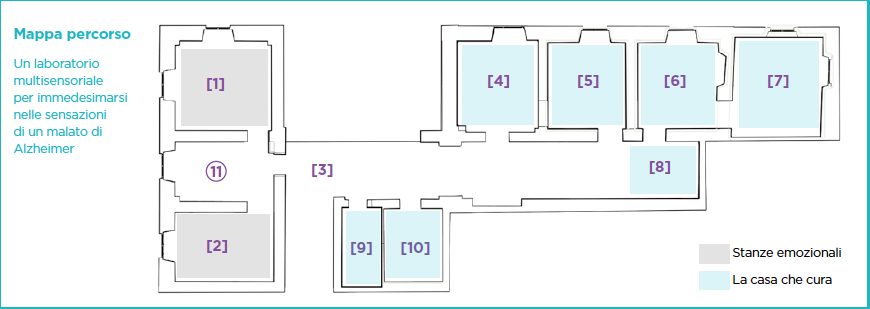 - Stanza emozionale: una voce narrante evoca, in forma di lettera a una persona cara, le progressive sensazioni di perdita e spaesamento di chi si trova agli stadi iniziali della malattia, accompagnate dalle immagini trasmesse da un grande schermo