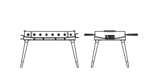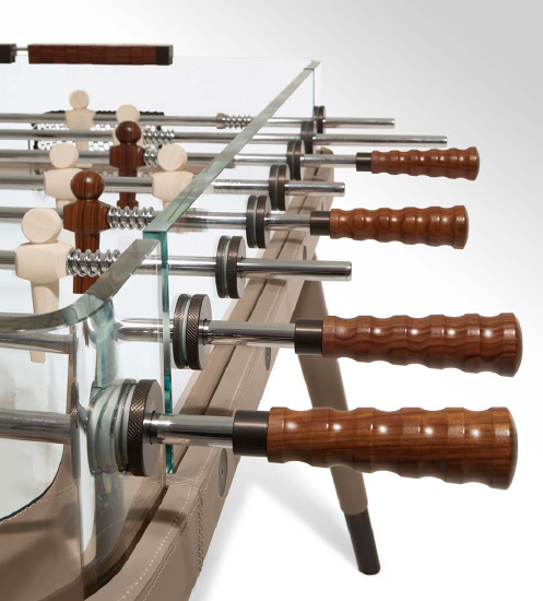 Calcetto con vasca e sponde curvate in cristallo extra chiaro, spessore 8 – 15 mm. Le gambe e il telaio sono in legno, rivestito in cuoio, disponibile in diverse tonalità, che rende questo calciobalilla unico nel suo genere. Le manopole sono in pau ferro, e i giocatori sono in pau ferro e frassino sbiancato. I puntali e le boccole sono in alluminio bronzato