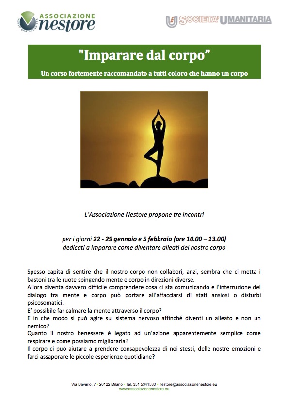 “Imparare dal corpo, tre incontri nei giorni 22-29 gennaio e 5 febbraio (ore 10.00 – 13.00) dedicati a imparare come diventare alleati del nostro corpo. Spesso sembra che ci sia come un’interruzione del dialogo tra mente e corpo, una specie di cortocircuito fra quello che vorremmo fare e quello che invece riusciamo a fare, che a lungo andare può portare anche all’affacciarsi di stati ansiosi o disturbi psicosomatici.