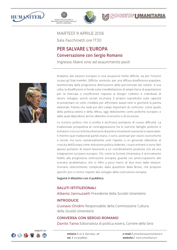 “Per salvare l’Europa: conversazione con Sergio Romano” – martedì 9 aprile alle ore 17.30