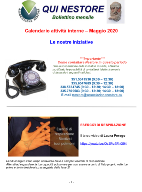 Ecco il bollettino QUI Nestore con le attività di maggio. In particolare il terzo video di Laura Perego “Esercizi di respirazione” per prepararci a riprendere le attività fisiche in questa “fase2”. I risultati del convegno tenutosi l’8 maggio “Vivere ai tempi del coronavirus”, promosso dall’Istituto Besta e AUSER, con la nostra collaborazione.
