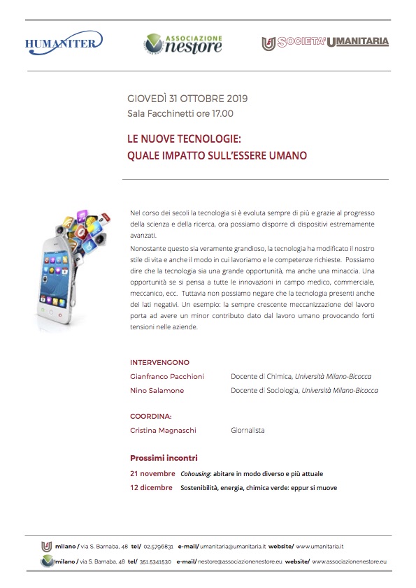 Associazione Nestore per il 31 ottobre – ore 17.00 – Sala Facchinetti – Via San Barnaba 48 – Milano, ha organizzato una tavola rotonda dal titolo “Le nuove tecnologie: quale impatto sull’essere umano”.