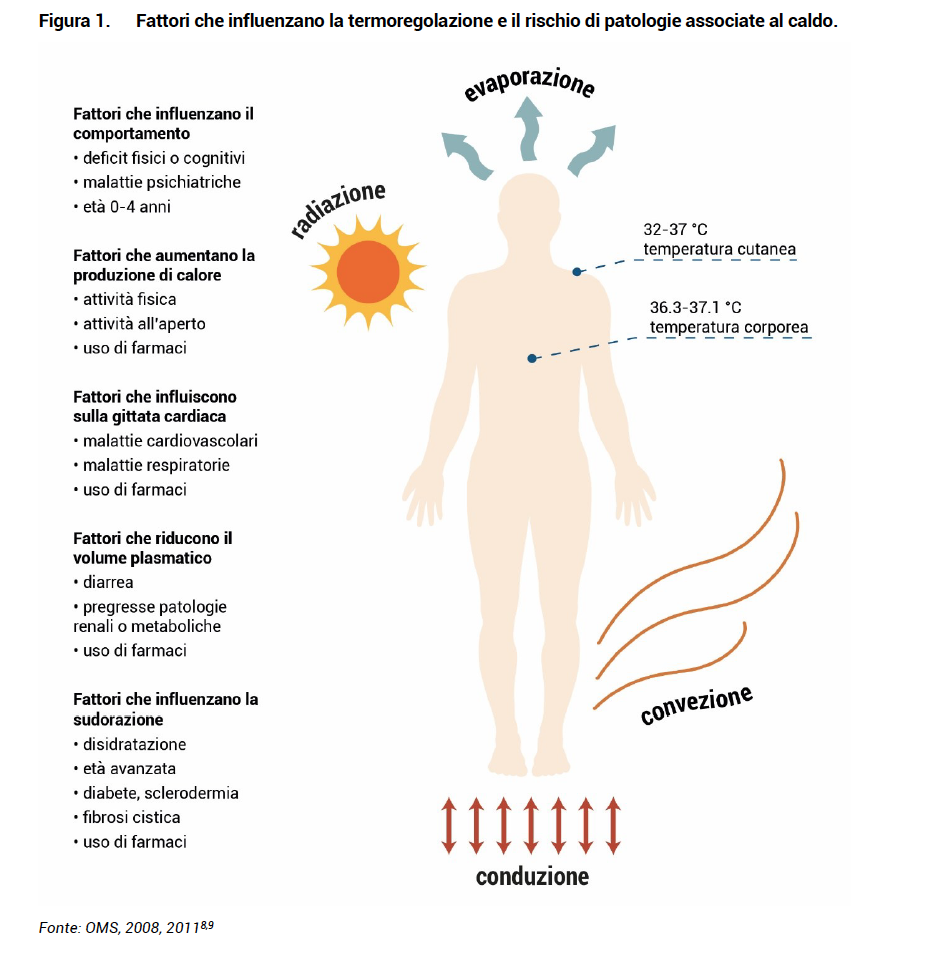 Alcune condizioni individuali compromettono la risposta termoregolatoria e provocano accumulo di calore e innalzamento della temperatura corporea interna al di sopra dei limiti fisiologici, con insorgenza di effetti sulla salute di gravità crescente. Questo avviene se si riduce la possibilità di mettere in atto comportamenti per proteggersi dal caldo, come avviene in persone affette da demenza o disturbi psichici o nei bambini piccoli, se sono presenti disfunzioni a carico delle ghiandole sudoripare, ad esempio in caso di diabete, sclerodermia e fibrosi cistica, in presenza di condizioni che modificano la risposta cardiovascolare, come infezioni batteriche o virali, patologie renali o del sistema cardio-respiratorio. Altri fattori rappresentano un rischio anche per persone adulte sane, ad esempio l’esercizio fisico intenso all’aperto (es. lavoratori all’aperto, atleti), soprattutto in assenza di adattamento fisiologico e abbigliamento pesante (es. dispositivi di protezione individuale nei lavoratori). Le patologie associate al caldo sono descritte di seguito.