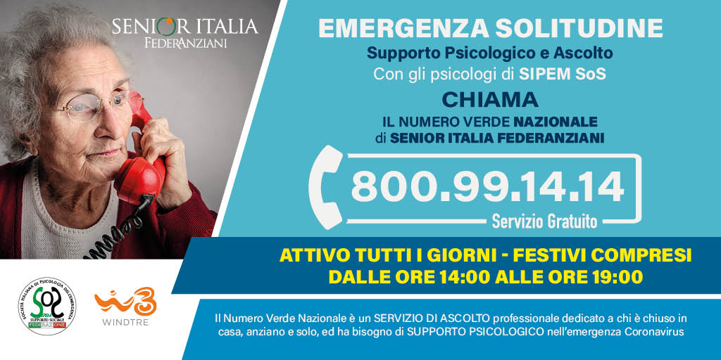 L’emergenza Covid si è rivelata giorno dopo giorno un banco di prova per le forze del nostro sistema sociale. Ed è in questo momento, che ha colpito soprattutto i più fragili, che è emerso così spesso anche il volto più forte della nostra comunità: il volontariato. Per questo, quest’anno, il 5 dicembre, Giornata Internazionale del Volontariato, acquista un valore speciale, un invito a riflette su quanto sia insostituibile questo mondo, ma anche uno stimolo, per tutte le forze che ne sono parte attiva ad andare avanti, con un’attenzione particolare ai più fragili, gli anziani in primo luogo, vittime principali di questa pandemia e, più di tutti, costretti ad affrontare quegli stravolgimenti della vita quotidiana richiesti dall’emergenza. E’ attivo, grazie alla collaborazione tra Senior Italia FederAnziani, WINDTRE e SIPEM SoS Federazione, il numero verde 800.99.14.14 che offre un supporto psicologico agli anziani in questo periodo di isolamento. Il numero verde è raggiungibile da telefono fisso e mobile, dal lunedì alla domenica dalle ore 14.00 alle ore 19.00. Il numero è attivo anche nei giorni festivi e continuerà ad esserlo durante le festività natalizie, giornate più difficili per l’emergenza solitudine.