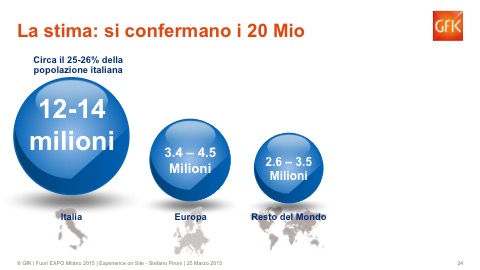 NB: i dati di questa pagina sono prodotti da GfK, Official Market Research Sponsor di EXPO Milano 2015, fornitore ufficiale dei dati riguardanti il pubblico dei visitatori per profili psicografici, bisogni e attese, ma anche fornitore di dati sull’indotto di Expo, al di fuori del perimetro formale dell’Esposizione.