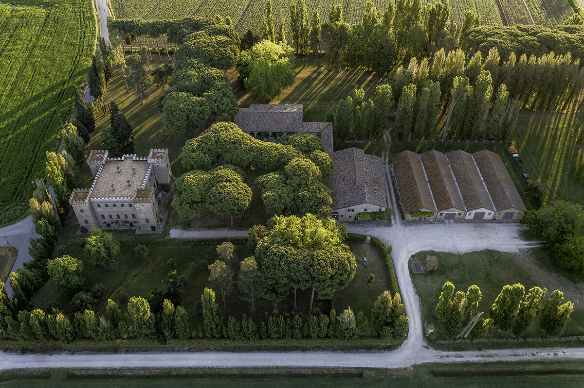 Castello Benelli ha conservato l’assetto del giardino-campagna attraverso pini marittimi secolari insieme a enormi platani, olmi e cipressi affusolati. Per gli amanti dei fiori, qui si possono ammirare anche gelsomini profumati e soprattutto una grande varietà di rose, da quelle screziate di Bologna alle eleganti Pierre de Ronsard. Lo spazio aperto diviene giardino ai margini dei terreni agricoli che conducono visivamente alla residenza padronale secondo un concetto di continuità visiva e naturale.