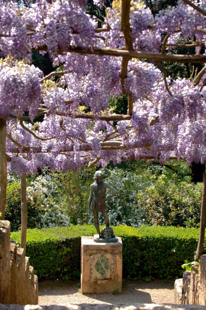 Appena oltre l’ingresso, dopo il portale cinquecentesco, sulla sinistra si trova il chiostro, un grazioso cortiletto in stile arabo-siculo-normanno. Il Viale dell’Immenso è il percorso principale che attraversa il giardino di Villa Cimbrone e porta dall’ingresso della villa fino alla Terrazza dell’Infinito. Il viale è coperto da rampicanti di glicine bianco e blu, e se la si visita durante la primavera quando il glicine è in fiore, l’atmosfera che troverete è a dir poco paradisiaca.