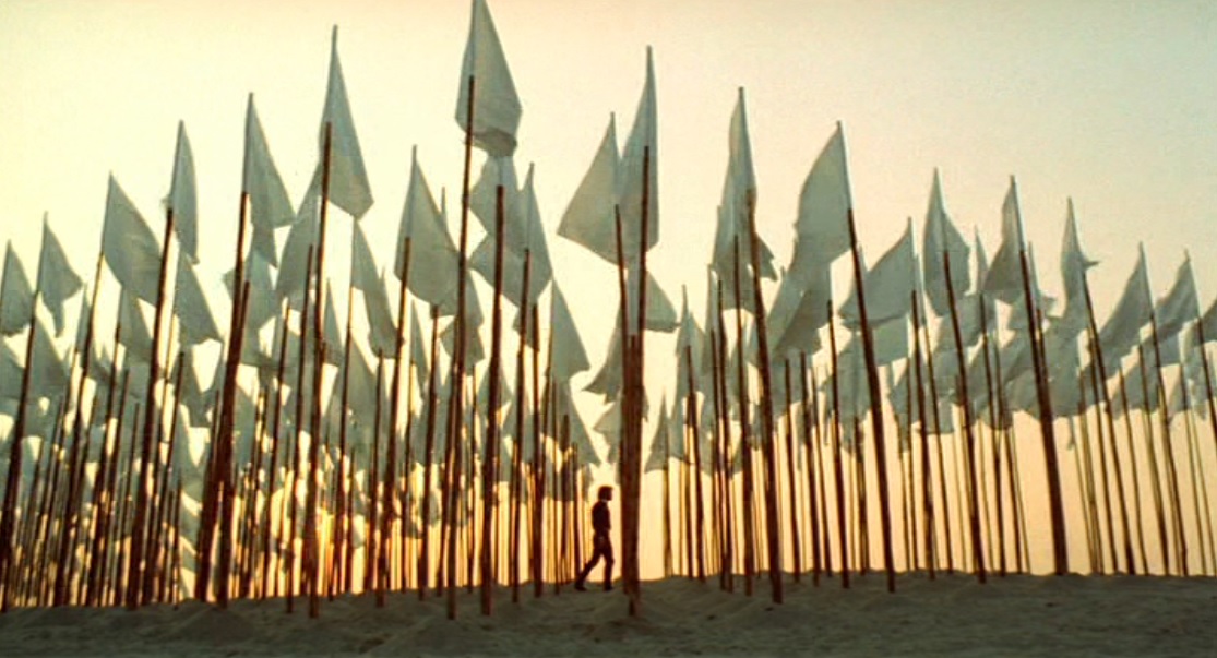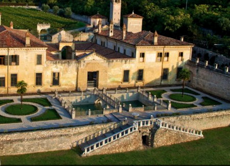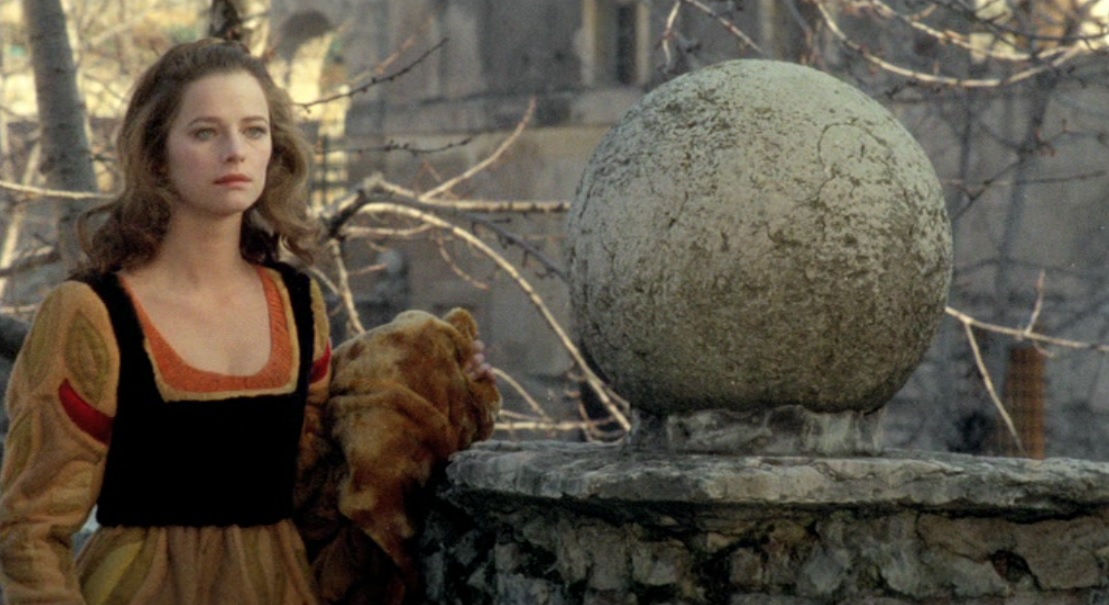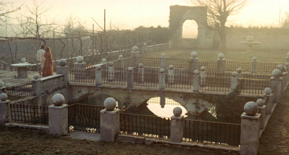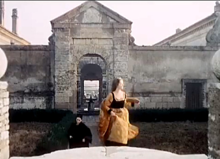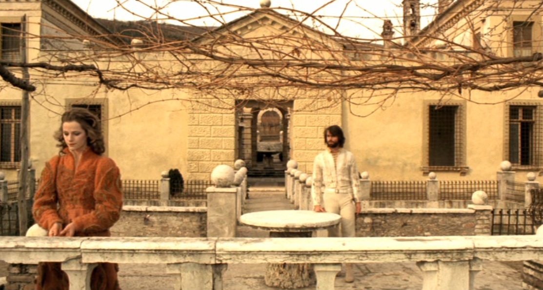 E qui il discorso si sposta sulla scelta delle ambientazioni per le varie sequenze del film. La ricca dimora di famiglia di Giovanni e Annabella è Villa della Torre Allegrini di Fumane (Vr), una ventina di km dalla città scaligera, attualmente attrezzata a relais di lusso. Il banchetto (e la strage) finale hanno luogo nella Galleria degli Antichi, suggestivo luogo di Sabbioneta, la “piccola Atene” dei Gonzaga, nelle campagne di Mantova, città ideale del rinascimento il cui progetto è dovuto in gran parte a Vincenzo Scamozzi, allievo di Andrea Palladio, e al mecenatismo di Vespasiano Gonzaga (1531-1591) che ne fece la capitale del suo feudo. Le brevi sequenze veneziane sono girate a Ca’ Rezzonico (tardo seicentesca) mentre altre sono ambientate nel medievale Castello Scaligero di Sirmione, sul Lago di Garda. Insomma, un insieme di luoghi che contrassegnano quel paesaggio italiano che, anche al di fuori delle mete più rinomate del “Grand Tour”, caratterizza il nostro paese e lo rende così unico. A tale proposito anche una semplice lingua di sabbia sulle rive del Po, “vestita” dallo scenografo con una selva di aste di bandiere rappresenta una suggestione visiva che collega le altre e più rinomate location.