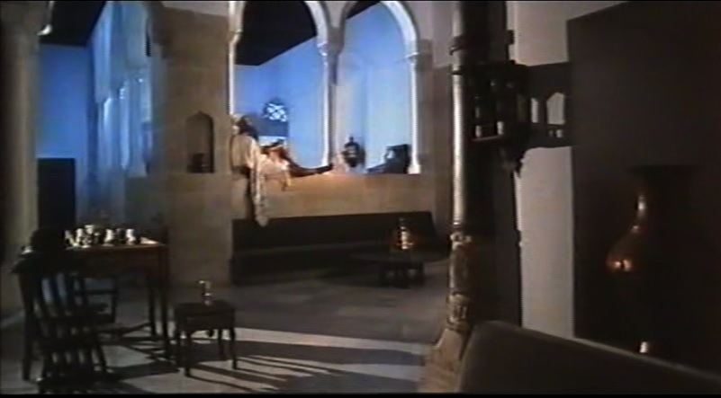 Nel patio (khan, in arabo) dei gitani, un po’ osteria, un po’ salotto, luogo di incontro di mercanti, sfaccendati e giovani, Abdallah, che ha la passione per la danza, viene avvicinato da Soad, un emissario della setta dei fanatici. Per toglierlo d’impaccio Marwan intona una canzone e Manuella si lancia in una danza travolgente che in breve coinvolge anche Abdallah. Il giovane è così momentaneamente sottratto al pericolo. Questa scena è una delle tante in cui i personaggi cantano e ballano, scene che hanno indotto alcuni critici a parlare (a sproposito) del film come di un musical. Musica e danza hanno una funzione squisitamente espressiva e sono legate in modo organico allo sviluppo drammaturgico del racconto. La musica (e la danza) cadono sempre come prolessi o come epilogo di un momento drammatico, anticipano o seguono un nodo particolarmente importante dell’azione. A volte, come qui, sciolgono la tensione e rispondono, in modo metaforico, ai problemi posti dalle parole del fanatico; altrove rappresentano un momento di sospensione contemplativa o poetica su cui irrompe il dramma o la violenza. La musica e la danza fanno insomma parte della vita che viene rappresentata e non ne sono un abbellimento o un fronzolo. Il testo delle canzoni di Marwan dovrebbe bastare a orientare in questo senso la sensibilità dello spettatore.