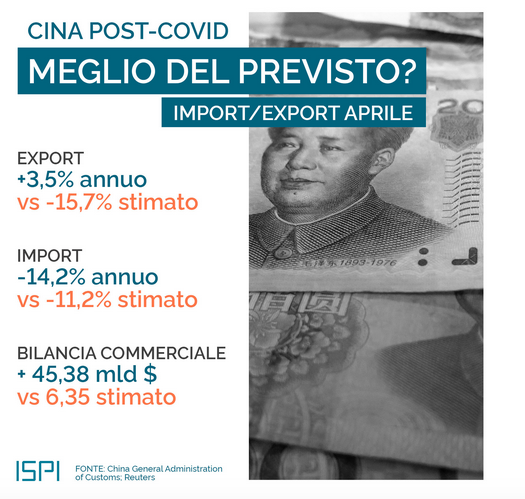 E mentre in America ed Europa crolla la produzione industriale e si attende la peggior recessione degli ultimi 50 anni, a sorpresa la Cina registra ad aprile un surplus commerciale di oltre 45 miliardi di dollari. Più del doppio sui 19 miliardi di marzo e ben oltre i 6-10 miliardi attesi dagli analisti. Secondo i dati diffusi dalle Dogane cinesi, che fotografano gli effetti sull’economia della pandemia del Covid-19, l’export è cresciuto a sorpresa del 3,5% annuo a fronte del -6,6% di marzo e del -12,1% stimato, mentre l’import ha accusato un crollo del 14,2% annuo contro il -0,9% di marzo e il -12,4% stimato. Una crescita inattesa e trainata dalla richiesta di mascherine e altri presidi sanitari e dalla ripresa della produzione nelle aziende cinesi mentre il resto del mondo chiudeva progressivamente i battenti. Difficile credere – concordano gli analisti – che si tratti di un trend sostenibile, ma con le economie del mondo in picchiata, di certo questi numeri non passano inosservati.