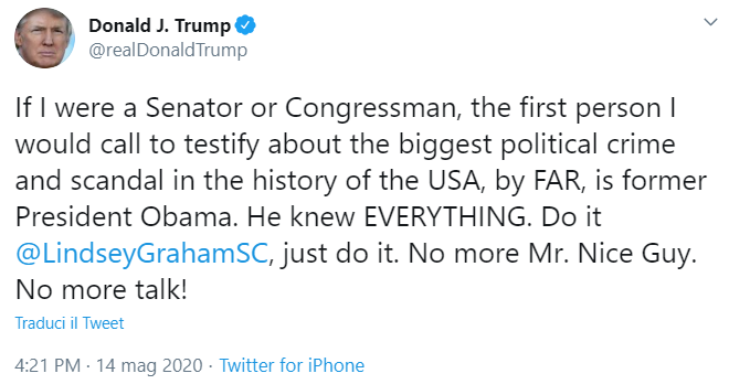 Quello che il presidente ha ribattezzato “Obamagate” – ma che la stampa concorda nel definire un insieme di accuse più o meno vaghe e prive di dettagli – meriterebbe, secondo lui, che l’ex presidente fosse chiamato a risponderne in Senato. Un atto clamoroso, al punto che anche all’interno partito repubblicano in molti frenano. Ma anche questa, secondo il New York Times, sarebbe una “strategia diversiva” per distogliere l’attenzione dalla gestione della pandemia. Che il presidente, che i sondaggi danno in calo nelle intenzioni di voto in vista delle elezioni di novembre, si senta già con le spalle al muro?