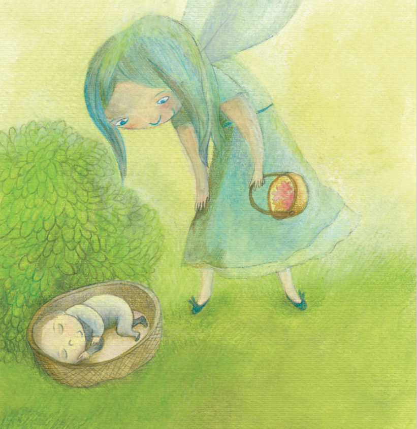 Tanto tempo fa, nei boschi sulle Alpi Apuane, le montagne che guardano il mare, si diceva che abitassero le fate. Una di queste, un giorno, mentre stava raccogliendo fiori, trovò abbandonato sotto un cespuglio un bimbo piccolo che dormiva beato. Si guardò intorno, cercando di non farsi scoprire, ma non vide nessuno. Alla fata il piccolo sembrò bellissimo, così lo prese delicatamente e lo portò di corsa dalla regina delle fate. Voleva chiederle il permesso di tenerlo con sé, anche se sapeva bene che le fate non possono avere contatti con il mondo degli umani. Così disse alla regina delle fate: