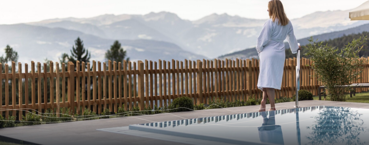 Appena entrati nell’ambiente, lo sguardo spazia dall’esterno verso l’indimenticabile scenario alpino altoatesino. Dopo un tuffo in acqua, si può nuotare per un tratto nell’area interna e, grazie a un collegamento, si può uscire all’aria aperta. Anche qui, accanto alla piscina, ci sono dei lettini dove potersi rilassare e riposare dopo la nuotata.