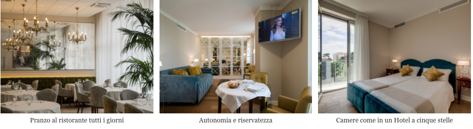 - Durante il soggiorno, l’ospite può sperimentare nuove soluzioni su misura come il monitoraggio clinico, la valutazione del decadimento cognitivo e il recupero funzionale con percorso fisioterapico